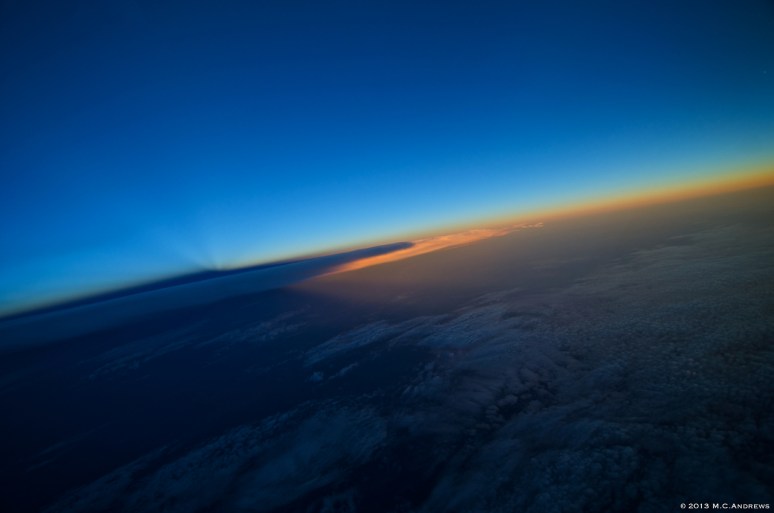 And something remarkable happens…Flying out of the sunset and into twilight while also flying around the blow-off of a storm over the Mississippi River…the cloud top crosses the earth’s terminator and the portion still in sunlight casts a shadow upward on the sky. The celestial shadows turn our normal view of the world upside-down.