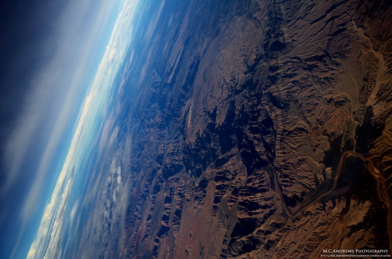 Departing Los Angeles on a cloudy morning, we look forward to climbing into the sunshine above the cloud layer and escaping the earthbound gloom…Though we are blessed with sunshine overhead, the cloud deck persists and we write off our hopes for scenery below. As we pass Las Vegas the clouds magically part as if the earth had been commanded to reveal itself. Our eyes follow Colorado River on its path through the Grand Canyon and gradually the vast expanse of scenery is fully revealed.