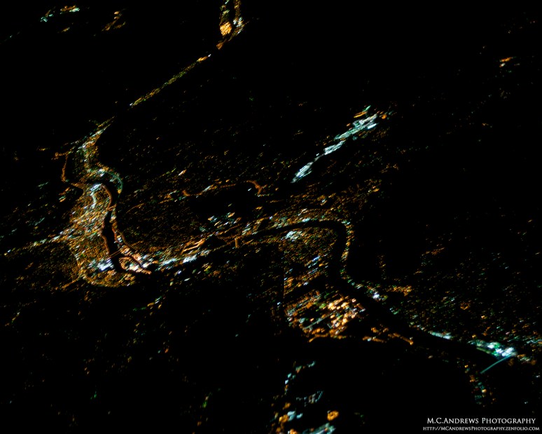 There are times that it seems we may never see the sun as we fall into a routine of flying through the night. In the darkness we are conveyed across the continent by our aircraft, the winds, and our will. In the moments when the darkness in the void between lights takes shape it communicates a sense of motion. One such dark conveyance is the Kanawha River as it exists between the lights and twists through the city of Charleston, West Virginia.