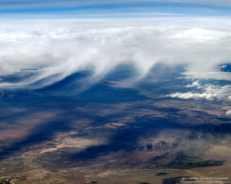 Passing southeast of the Coronado National Forest in Arizona, the scene is dreamlike as low wispy cirrus clouds stripe the desert floor with their shadows. In the space between shadows, the sun burns away a morning mist. Once completely obscured in the mist, the Peloncillo Mountains awake from their dreams. Meanwhile Mount Graham peeks out from under the layer and awaits its moment in the sun.