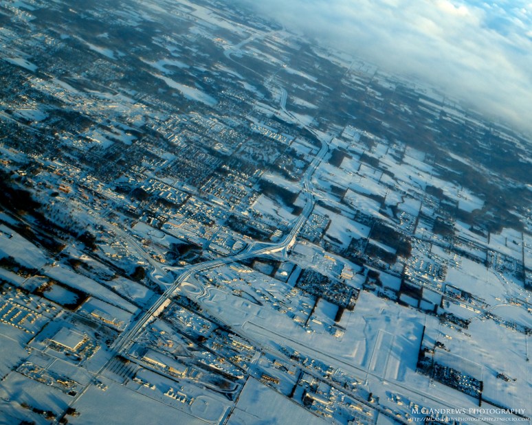 Shortly after dawn over Valparaiso, Illinois and the drifting snow has frosted the earth leaving a bright smooth white gloss to hide any rough edges from yesterday’s storm. The highway is pristine and there is not a car in sight to sully the crisp snowy scene.