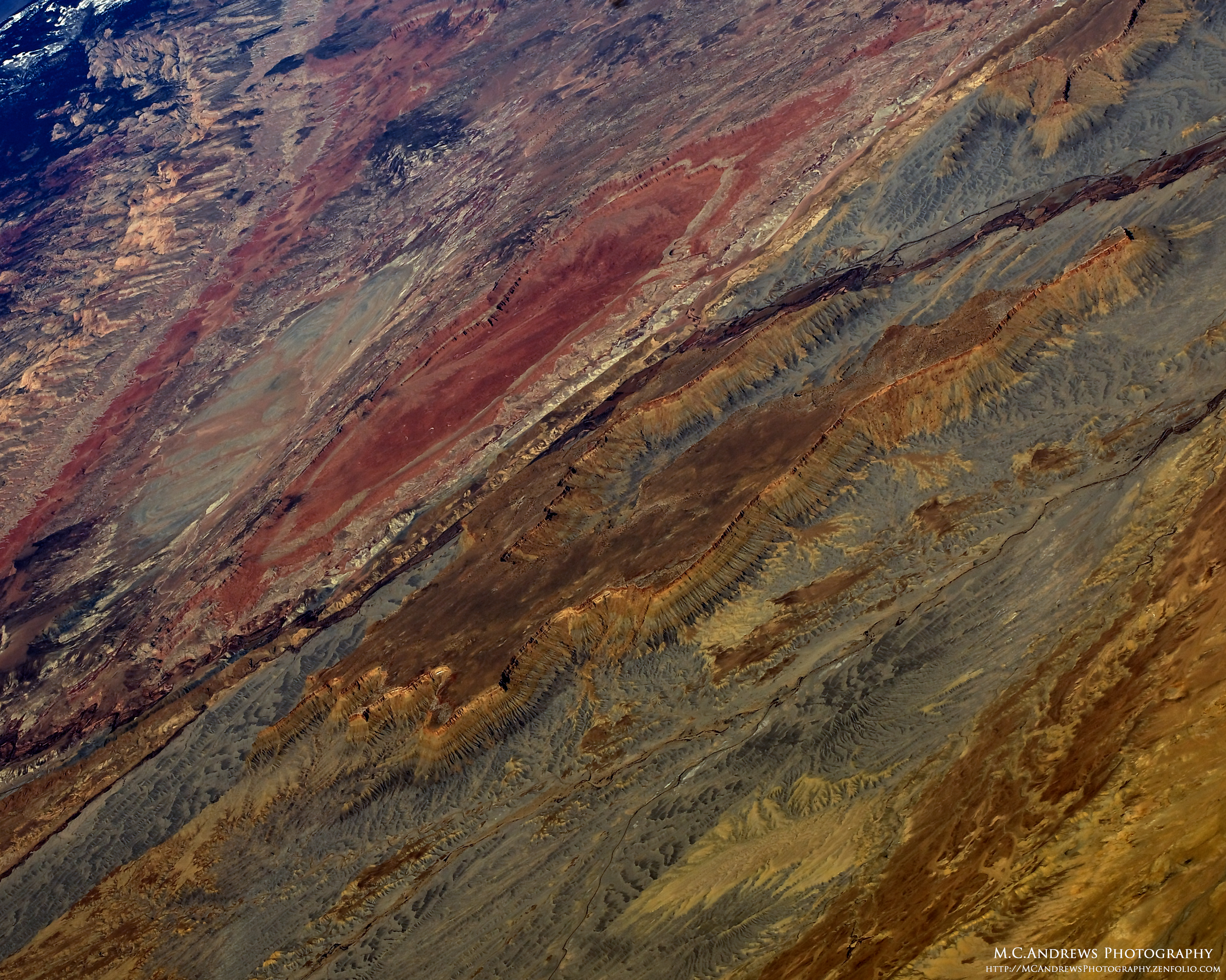 The colors of the South Cainesville Mesa and Red Desert near Capitol Reef National Park are reminiscent of the colors in a Remington pastel. The naturally occurring and dynamic palette of colors in the landscape of the American West create wondrous abstract patterns on the earthen canvas as their layers and textures are revealed in the raised lines and recessions along the mountains, mesas and desert floor.