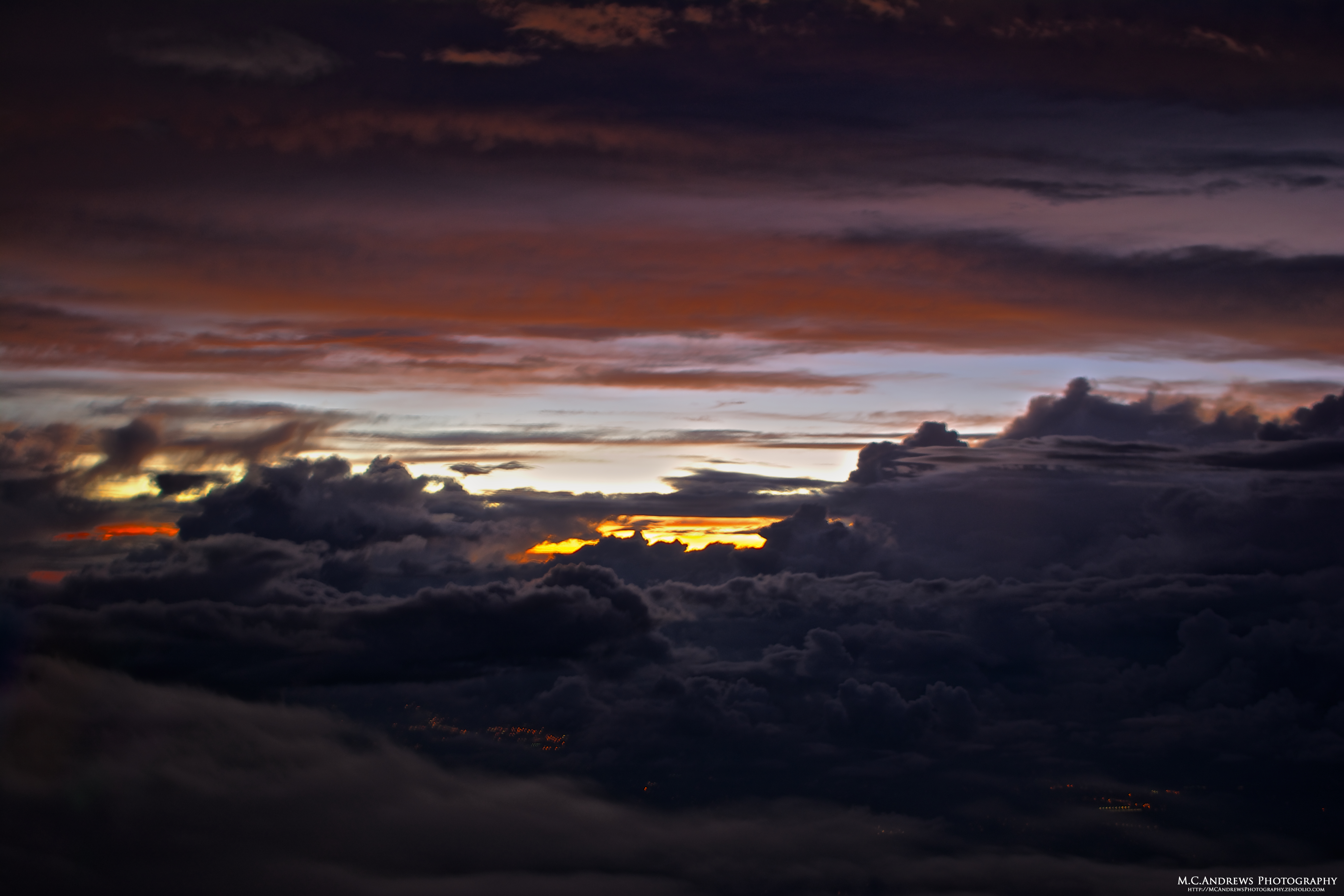 As we are bounced around in the shadowy and turbulent depths of a twilight storm, it seems that the day is done and our senses are resigned to the utter blackness of the storm. A few sharps turns around the core of the storm followed by a sudden down draft and we emerge from the storm to witness a dramatic and dreamlike cloudscape. The setting sun casts light through the misty wisps of vapor and backlights the dense cumulous clouds. This same stream of light is reflected off the overcast layer above us…the combined effect of the backlighting and reflected light creates a misty warm plum colored sky that draws us in and invites us to leave our memories of darkness and turbulence in the clouds behind us as we pursue the retreating sun. Finally, we descend below the horizon to make our approach to Atlanta and the scene silently fades into our dreams.