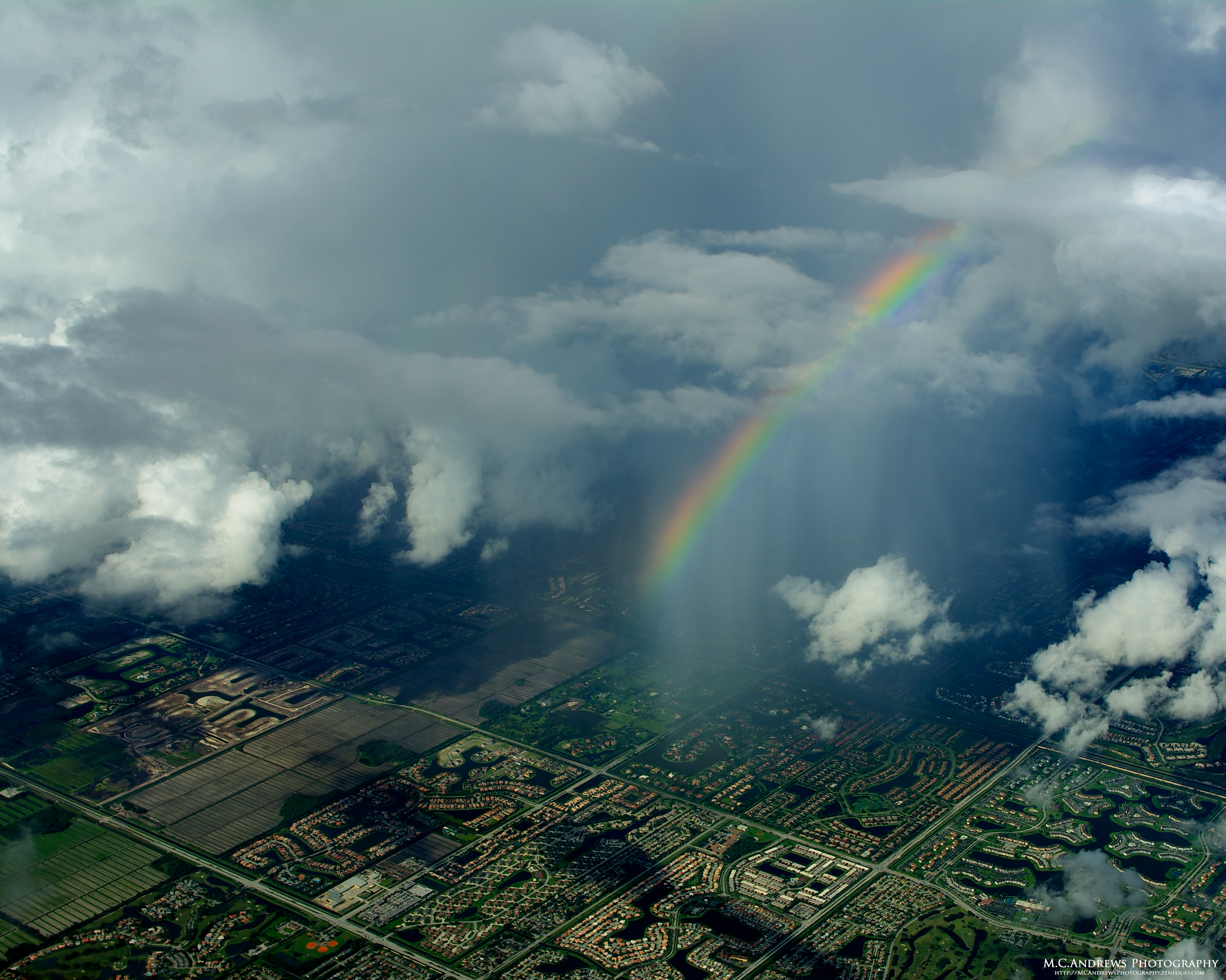 As we work our way around afternoon thunderstorms in South Florida, our sense of the air is at its peak. We are in tune with the waves of turbulence and the edges of the storms as we work radar, visual and the seat of our pants to find the safest path through the storms. This is the nature of working in the summer air and it can be as exhilarating as it is challenging. Once we arrive on the sunny side of the weather, it is time to look for our reward…Behind us, a rainbow forms in a shower as it sweeps across the planned neighborhoods and country clubs of Boca Raton. Starting as a glint of light in the criss cross of angular sun rays and vertically waving showers, the rainbow grows and stretches into a full blown arching bow. This was a great one…intense, bright and a fully defined spectrum of light. Next time, I invite you to lift your window shade, look outside, and share in this reward.