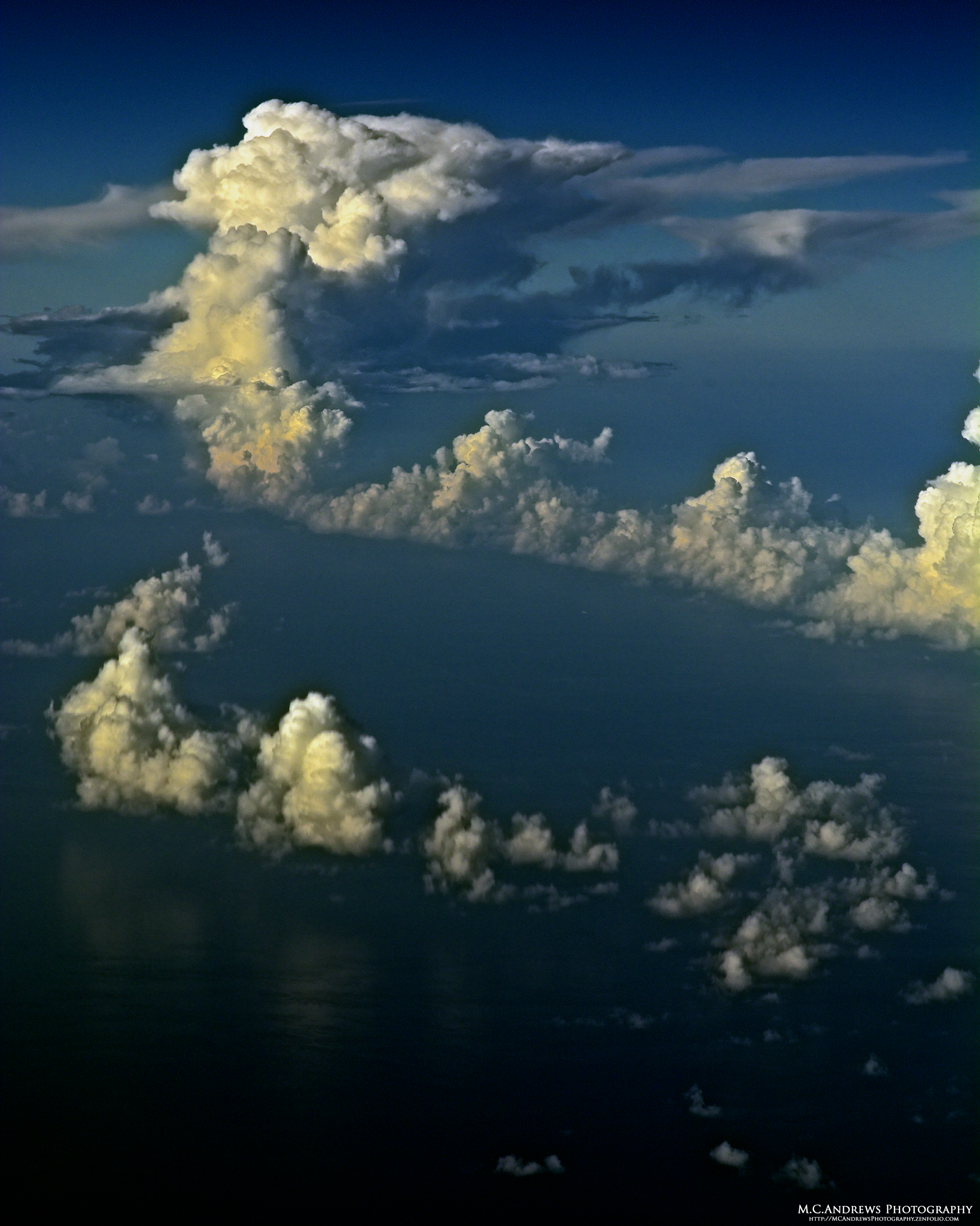 Soft images of small billowy cumulous clouds reflect on the calm surface of the Atlantic Ocean as the sun gradually warms the ocean and the morning’s weather builds. Soon this innocuous looking line of clouds will shatter their reflections as they churn the water beneath with their downdrafts as they grow into nimbus clouds. Behind this nascent line, a towering cumulonimbus cloud forms it anvil top and unleashes its energy on the airmass below.