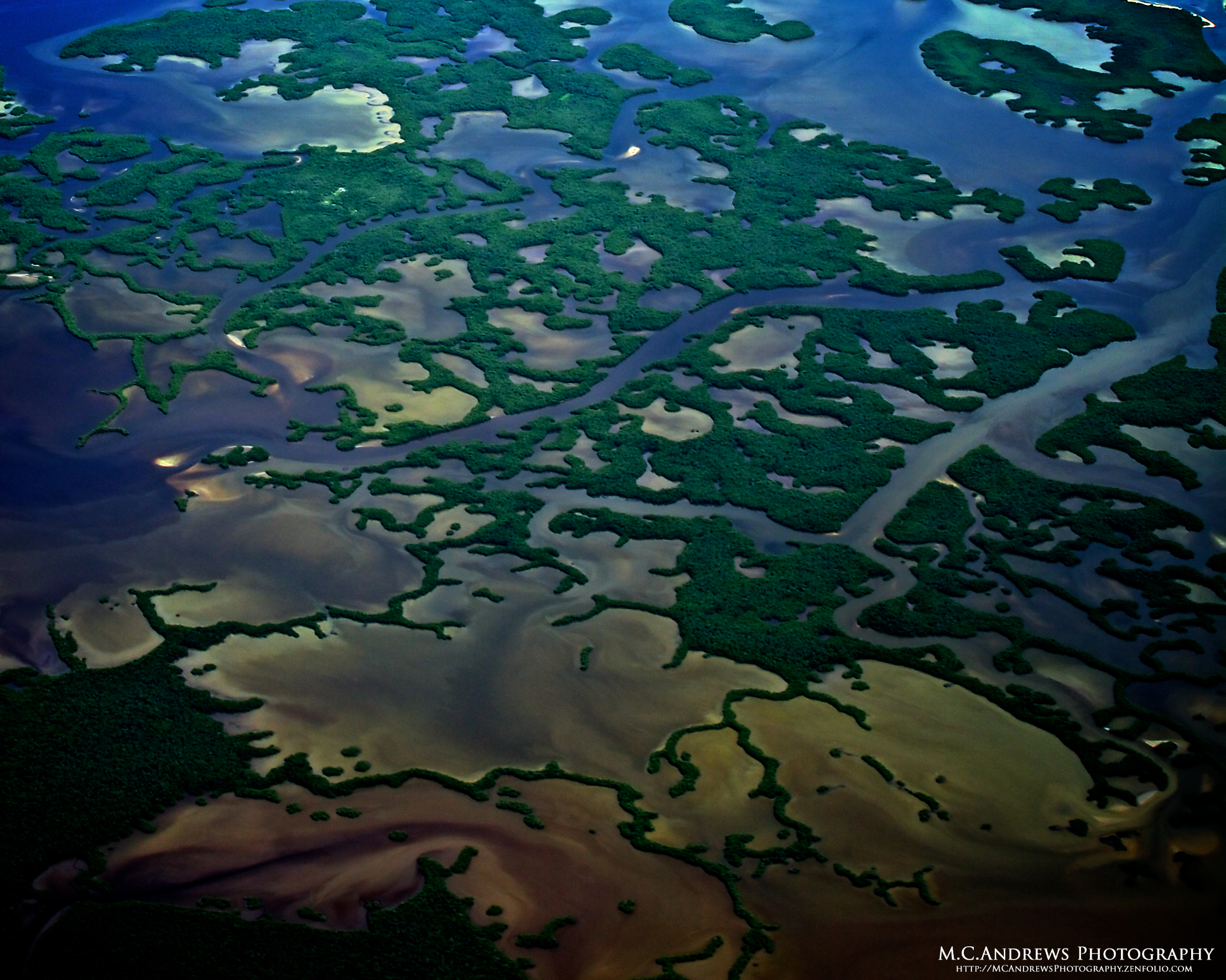 In the Everglades, the twisted lines of earth that encircle Gate Bay and creep slowly into the Gulf of Mexico appear as if some grand failed latticework…broken by the ebb and flow of tides yet still possessing of a beautiful delicate quality. These apparently fragile lines demonstrate resilience in the face of storms and merciless eroding tides. They are intertwined, networked, and codependent…and this gives them strength to stand up to the force of the sea. Though each minor strand of earthly fiber seems insignificant on its own, they act in concert to filter and gather drifting soil while absorbing and diminishing the awesome power of a lonely tide. A fascinating abstraction and a lesson in cohesion.