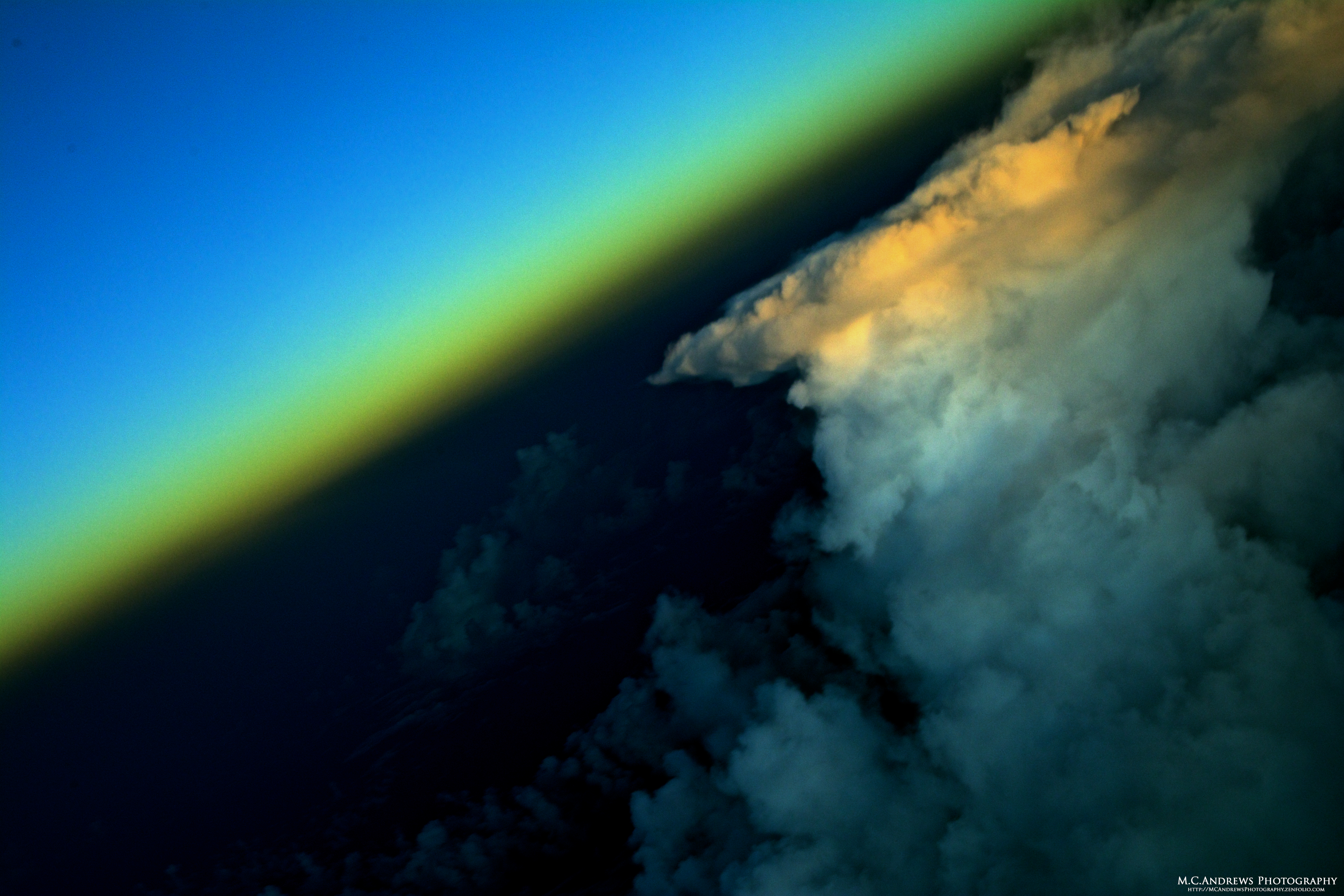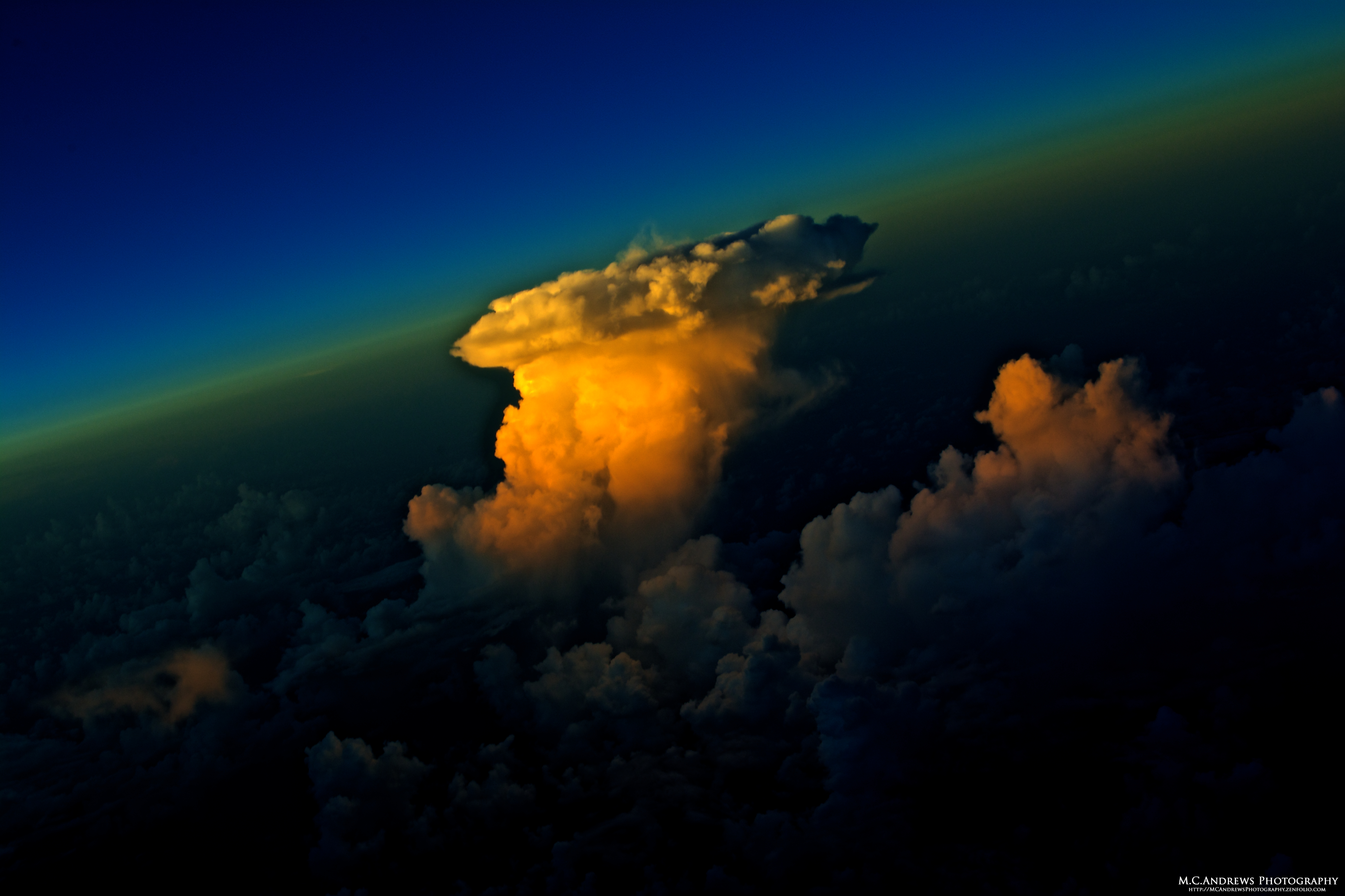 Looking eastward into the advancing night, the terminator approaches from the horizon. The last light of sunset illuminates a solitary stormy cluster.