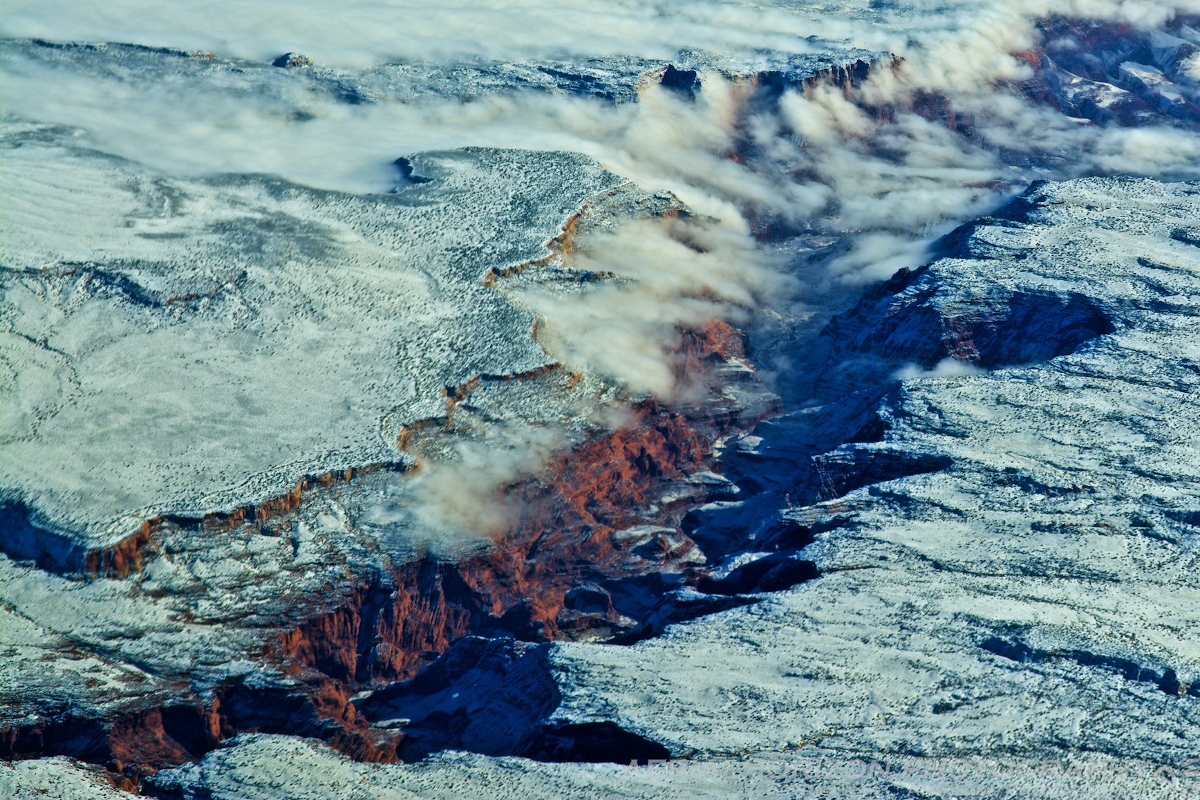 Snow fell across the American Southwest last week, leaving the high desert terrain under a blanket of white striped with bands of umber, orange, and vermillion…each mesa and butte displacing layers of snow high above the desert floor and each canyon falling away to reveal spectacular singular instances of colored vertical rock faces framed by the snow covered horizontal planes…Near Page, Arizona, fog rolls through the Paria Canyon.