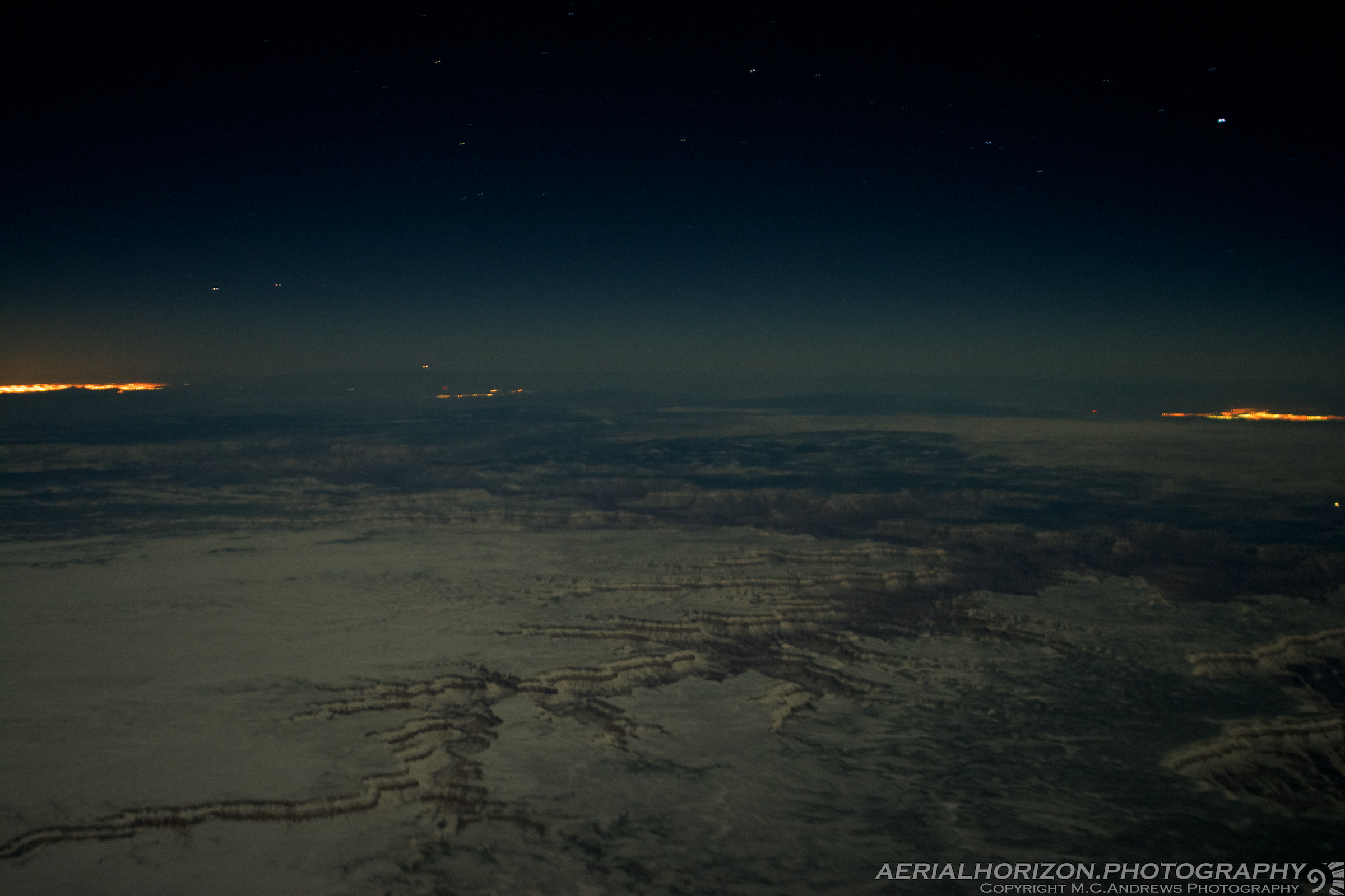 On a bright winter’s night, the snow-covered desert becomes a perfect reflector for the full moon and the landscape shines through the darkness in great detail, revealing the striped sides of Havasu Canyon and the Grand Canyon beyond.