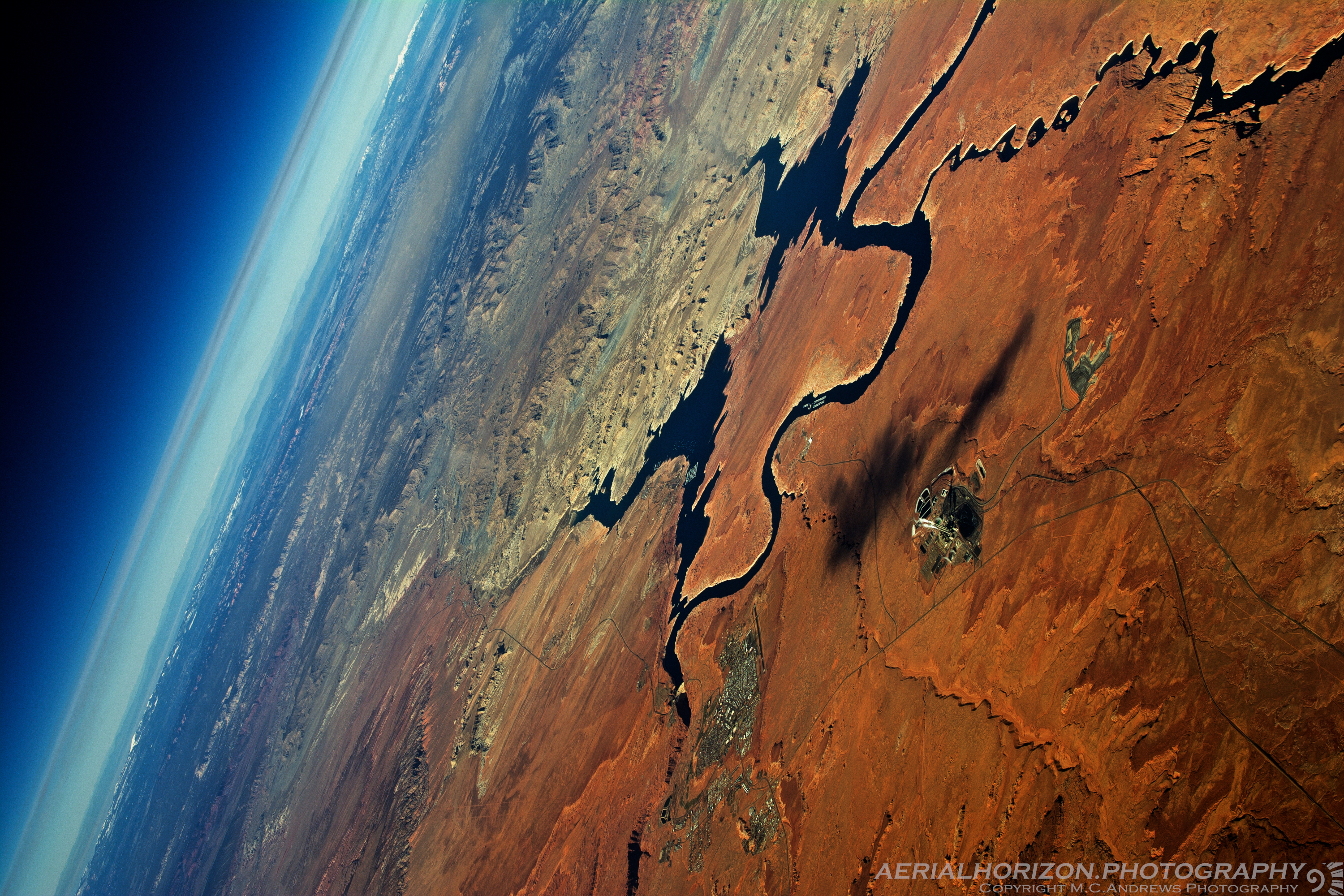 The path of the Colorado River through the high desert was hindered by the erection of the Glen Canyon Dam in 1964. We see the fan of its concrete face as the river turns toward Page, Arizona. The flow of the Colorado was slowed by the dam in order to flood Glen Canyon and form the massive Lake Powell, forever changing the landscape. Meanwhile the nature of the river remains unchanged as it continues to meander, winding and looping its way through the terrain on its westward path. In its wake, Antelope Island formed at the junction of two flooded canyons, changing the character of this ancient slice of land.