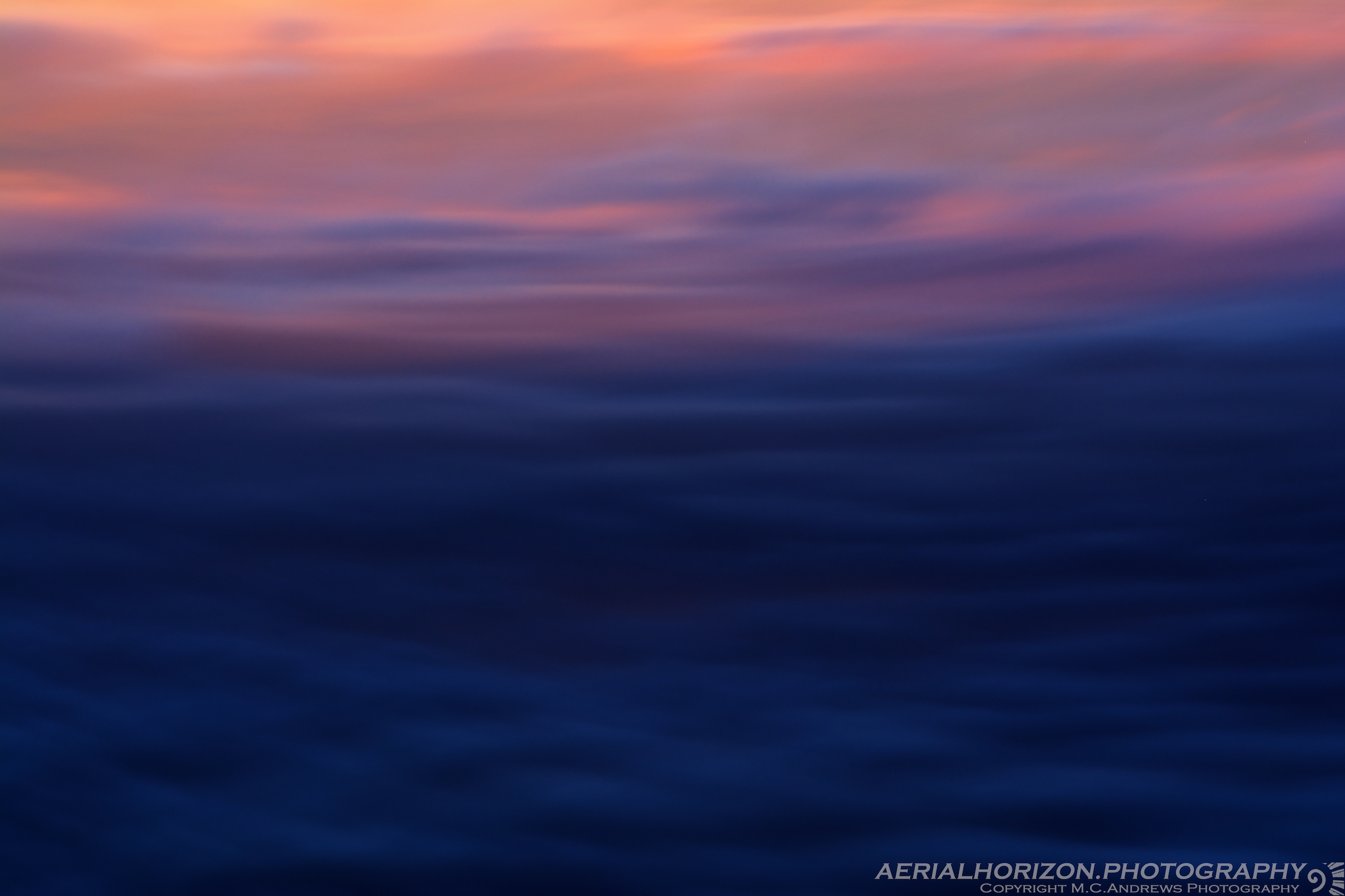 At a point just below the aerial horizon during the final moments of the day, the cloud deck flows away from the horizon, rolling into the night…The deep blue of indigo at the base of the gloaming seethes and buoys like the tide receding into the darkness as we float along tethered to the sunset.