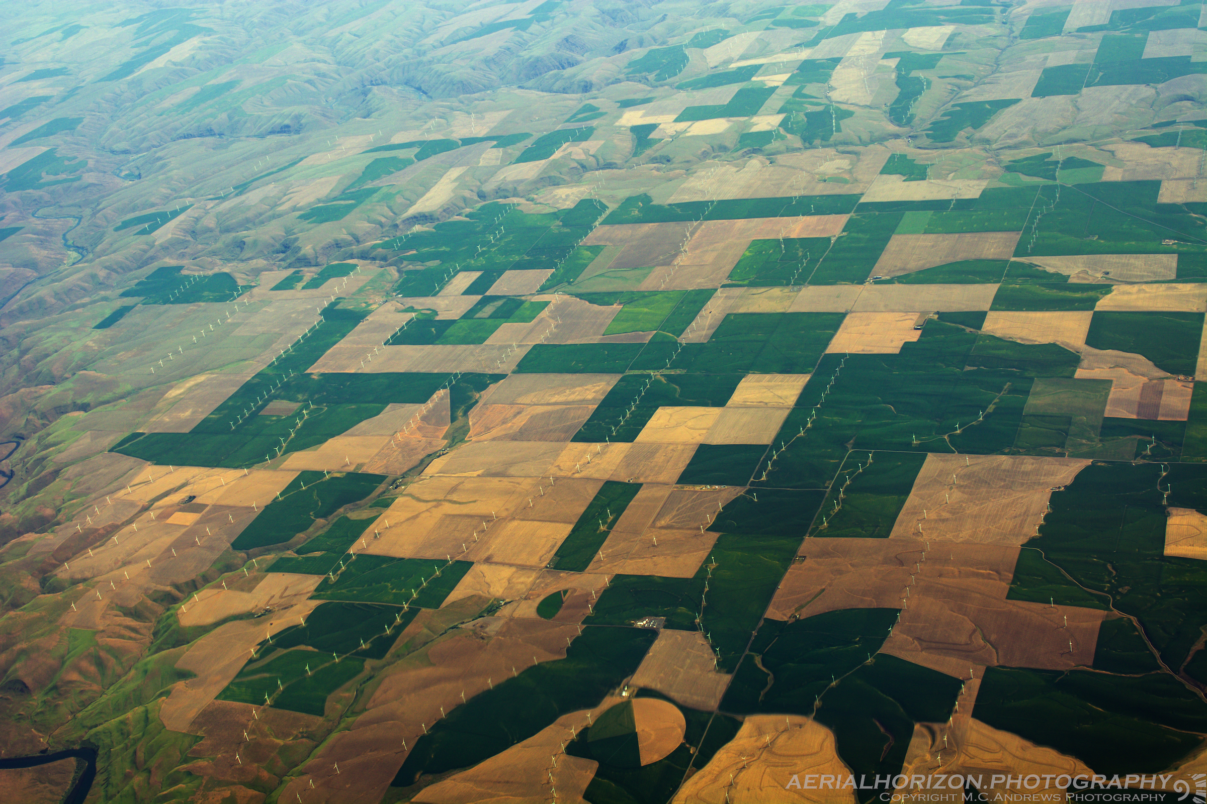 Harnessing the power of wind as it sweeps across a velvet landscape, wind turbines align in the Northern Oregon where tendrils of the Columbia grip the landscape and add contours to the rolling hills.