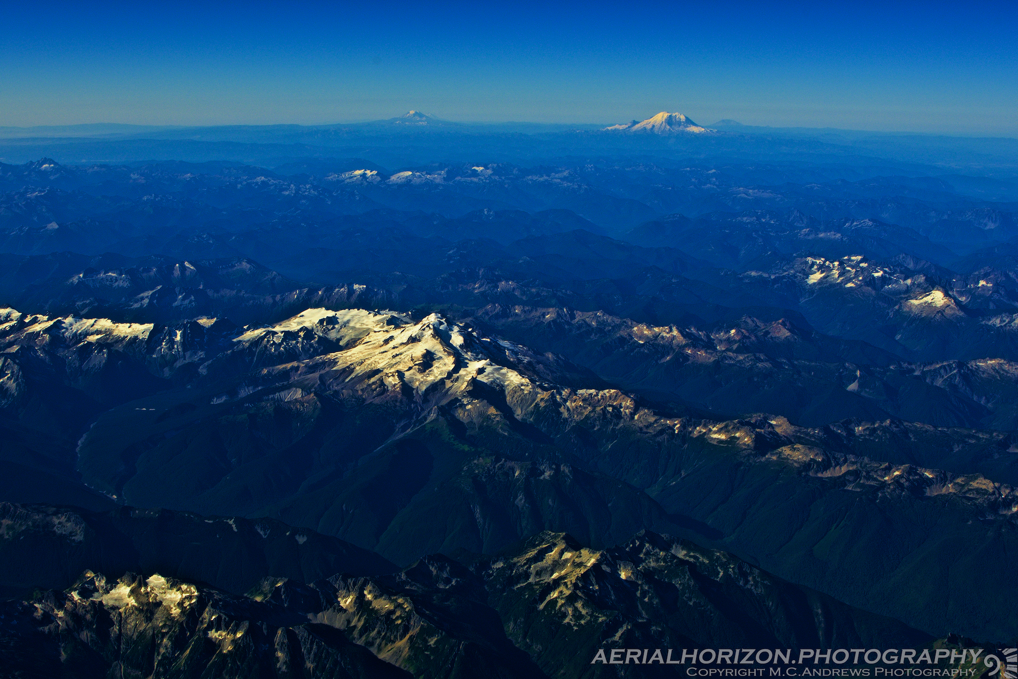 In the contrast of white on blue, the cool curving recession along the base of Glacier Peak adds a sense of depth and wraps into the maze as we pick our way through the Cascades toward Mount Rainier. Ironically, the snow covered peaks convey a sense of warmth as each crag and each shear face of ice along the mountains’ aging ice flows captures the light, defining each ridge line and the depth of our field of view.