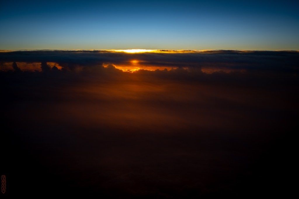 Beneath a sea of clouds where vaporous waves undulate in a thin primary swell, the slowly broaching sun washes the waves in a deep red pigment as they sweep across the shore and lift the sun toward the morning sky above.